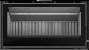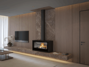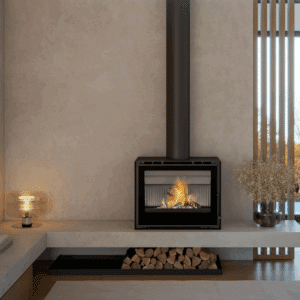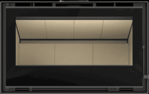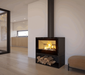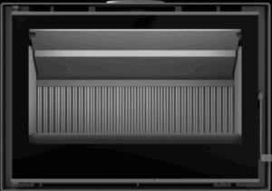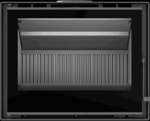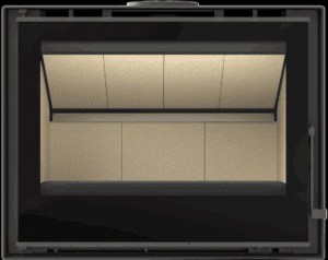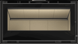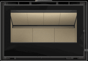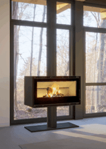 avec une large vitre panoramique et une diffusion homogène de la chaleur.